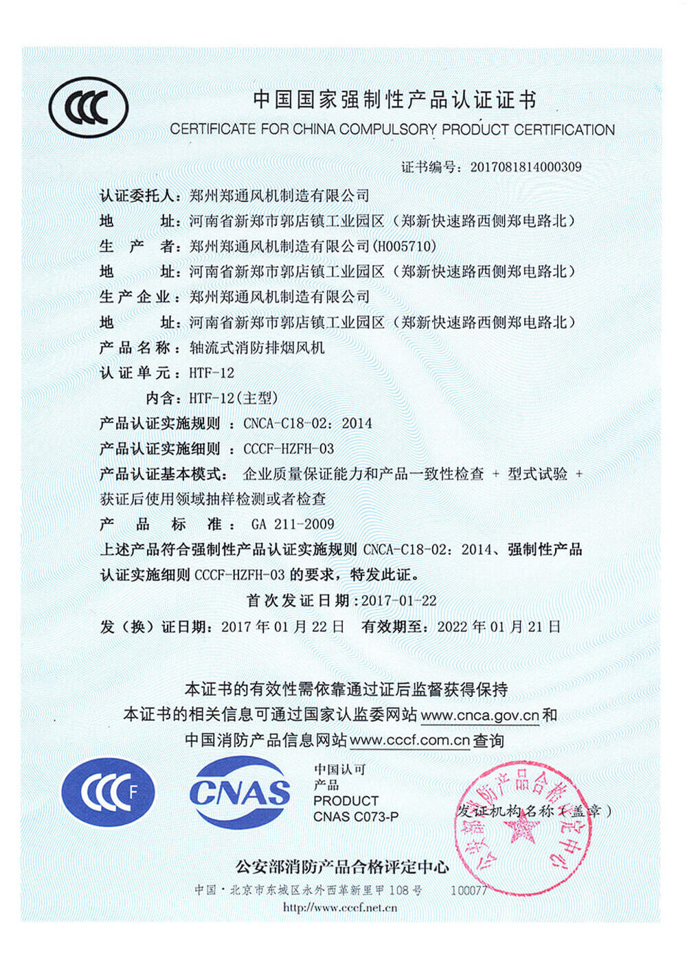 鄭通風(fēng)機(jī)主要產(chǎn)品包括:高壓風(fēng)機(jī)、不銹鋼風(fēng)機(jī)、消防排煙風(fēng)機(jī)、防腐防爆風(fēng)機(jī)、廚房排油煙風(fēng)機(jī)、玻璃鋼風(fēng)機(jī)、鍋爐引風(fēng)機(jī)、軸流風(fēng)機(jī)、柜式離心風(fēng)機(jī)、鍋爐引風(fēng)機(jī),產(chǎn)品通過ISO9001、ISO14001、ISO45001國(guó)際標(biāo)準(zhǔn)化組織制定的質(zhì)量管理體系認(rèn)證,部分產(chǎn)品通過了3C認(rèn)證和國(guó)家防爆電器產(chǎn)品質(zhì)量監(jiān)督檢驗(yàn)中心認(rèn)證。